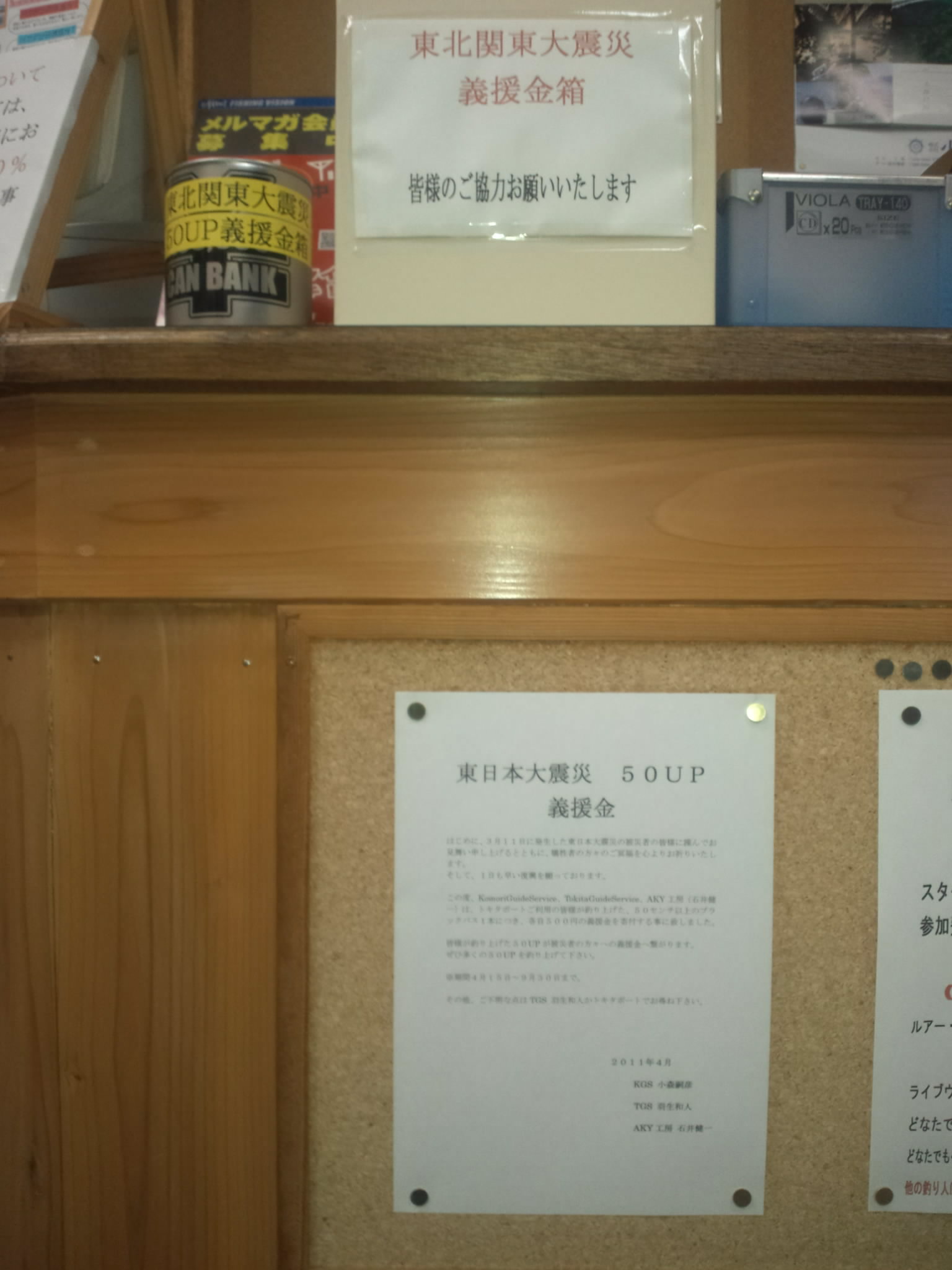 この度、KomoriGuideService(小森嗣彦)、TokitaGuideService(羽生和人)、AKY工房(石井健一)は、トキタボートご利用のお客様が釣り上げた50UPのバス1本につき、各自500円の義援金を寄付いたします。