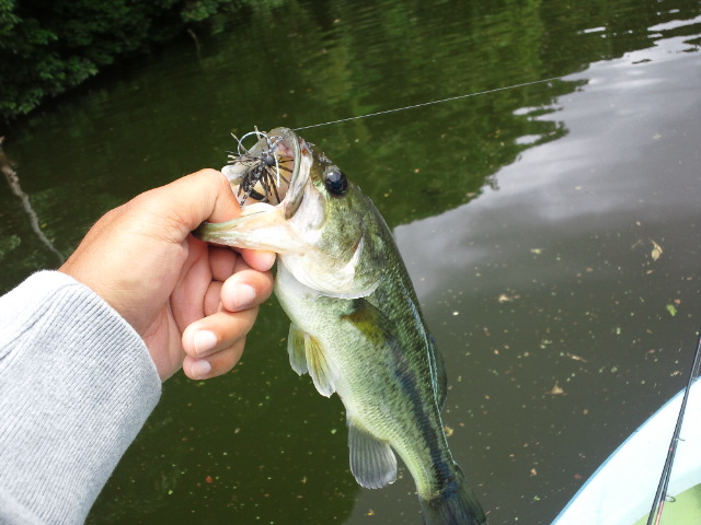 少し日が射すとバスはカバーの外を向くため、ミドスト気味にハングエッヂで誘ってやると出てきて口を使います。ルアーはスローに誘えるスモラバにレッグワームの亀山黄金コンビがベスト。ディスタンスは意外と近くても大丈夫です。ハングまわりにオイカワの群れがいたりするといいポイントです。