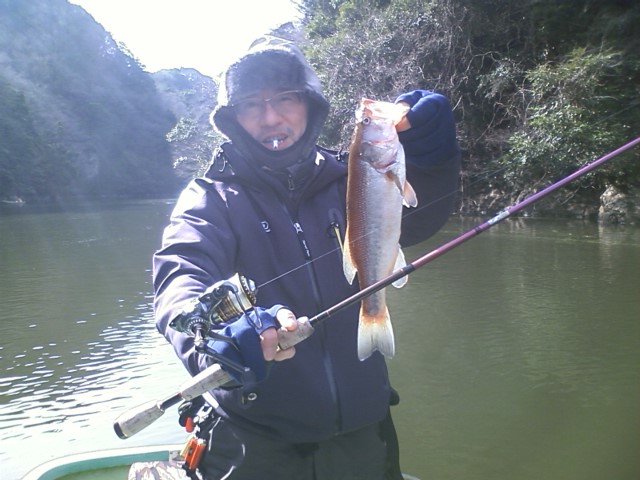 さすがに朝あれだけ冷え込むと厳しくはなりますね。九時頃までガイドが凍ってました。 朝から巻物で狙ってみたものの、あまり雰囲気がなく、少し手を出したライトリグで10Mでポツリポツリ。サイズはそれほど悪くもないのですが、浅い方を決めたいものです。その後も巻き続けましたがシャローはでませんでした。
