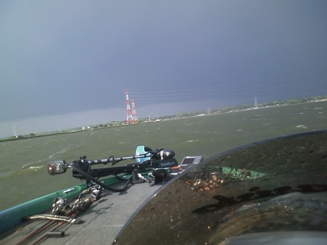 私は小さいときから雷が苦手です。湖面は激荒れ、周囲に誰もいないし、雲と晴れの間から怪しい光が射し込み、雷が頭上や遠方で縦や横に走りまくっています。そしてしだいに粒の大きな雨が降り始めました。特別に雷が嫌いな私だから感じるのかもしれませんが、この恐怖感と孤独感に勝るものはないとしみじみ感じます。 昔、琵琶湖湖北の真ん中で一瞬にして積乱雲にのまれ、大雨とあちこちに落ちまくる雷にあったことがあります。前回のこのフィールドでのトップ50の最終日もひどい雷雨で目の前の水門に落雷しました。