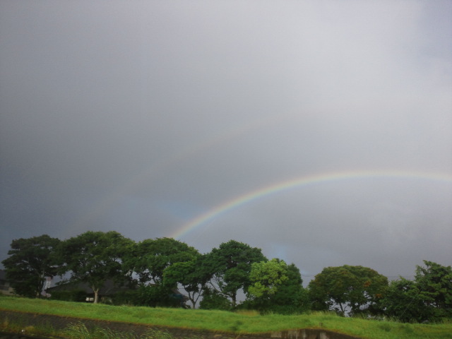 しかし今日は二度、大雨タイムがあり、夕方の雨からすっかり涼しくなった気がします。こうやって季節が進行していくことを願います。写真は豪雨がやってきた瞬間と雨の止み間に見えた虹。虹は二重でした。
