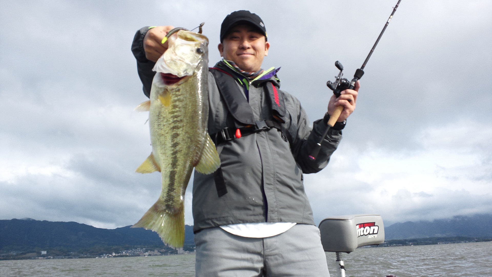 あまりの寒さに防寒の三点セット(ニット帽、ネックウォーマー、グローブ)を早明浦プラ荷物から復活させました。今日は水温も全く上がらず、私の狙っている魚はショートバイトでとてもタフな状態になってしまいました。それじゃデカいのだけ狙ってと5インチヤマセンコー5gテキサスでゲストさんが50アップキャッチです。